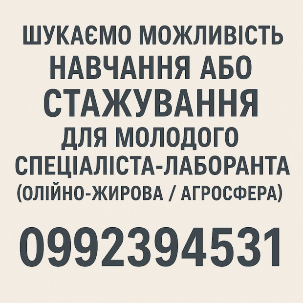 Шукаємо можливість навчання або стажування для молодого спеціаліста-лаборанта (олійно-жирова / агросфера)