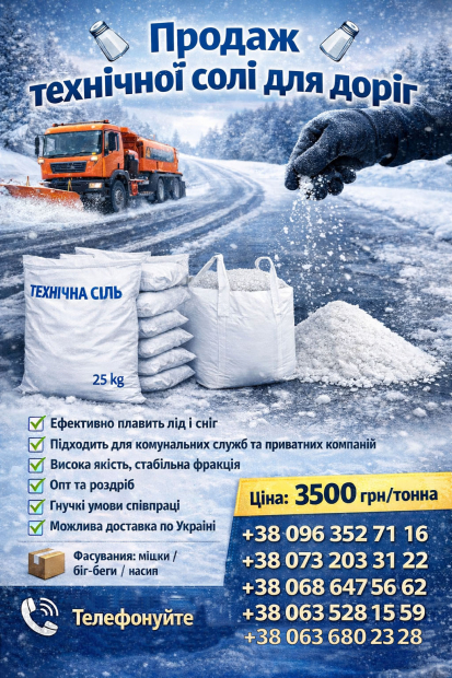 Пропонуємо якісну технічну сіль для зимового утримання доріг, тротуарів, парковок та промислових територій.